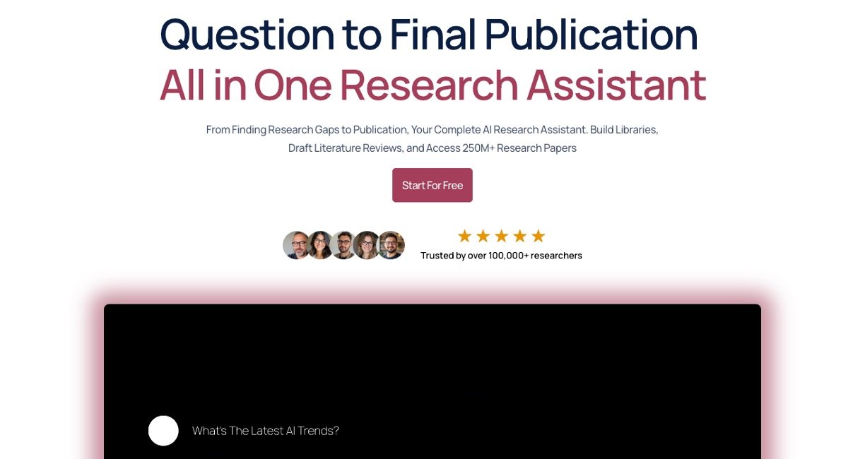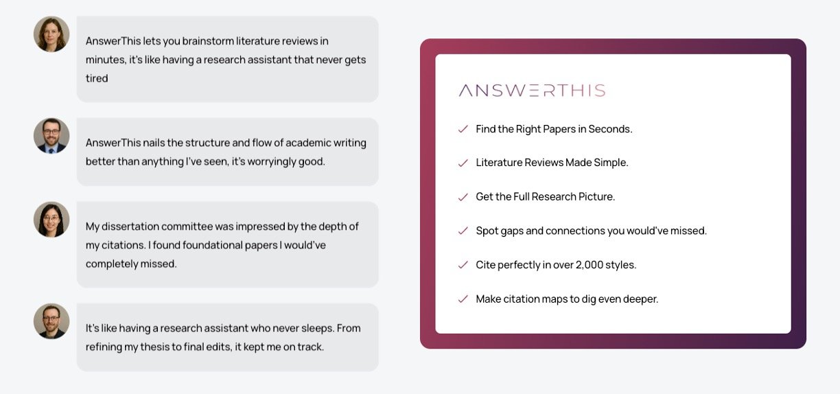 AnswerThis is an all-in-one AI research assistant built to help researchers and students manage the entire research process. It lets users find research gaps, build personalized libraries, and draft literature reviews easily. The tool scans over 250 million academic papers and online sources to deliver well-structured, citation-backed answers fast. Users can upload PDFs to ask questions and get clear summaries and explanations. It also includes AI-powered writing tools to help create outlines, paraphrase content, and edit papers smoothly. AnswerThis is designed to simplify research work for users with little technical knowledge.