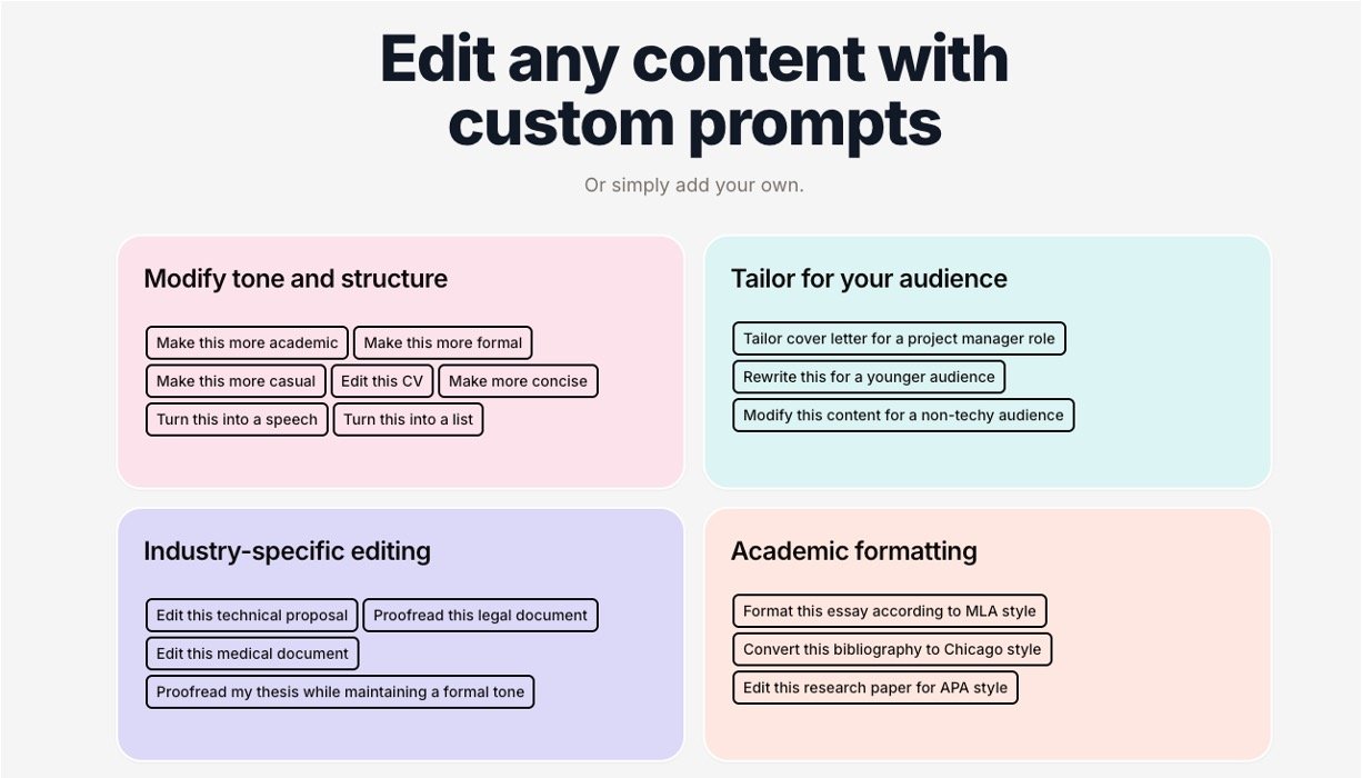Tone and Style Editor: Adjusts writing tone and style based on guidelines like APA, MLA, Chicago, and more.